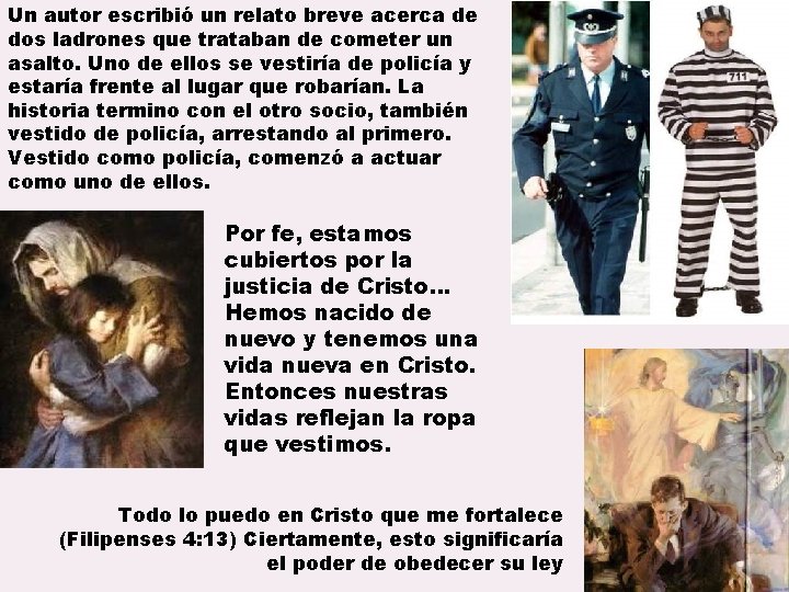 Un autor escribió un relato breve acerca de dos ladrones que trataban de cometer un asalto. Uno de ellos se vestiría de policía y estaría frente al lugar que robarían. La historia termino con el otro socio, también vestido de policía, arrestando al primero. Vestido como policía, comenzó a actuar como uno de ellos. Por fe, estamos cubiertos por la justicia de Cristo… Hemos nacido de nuevo y tenemos una vida nueva en Cristo. Entonces nuestras vidas reflejan la ropa que vestimos. Todo lo puedo en Cristo que me fortalece (Filipenses 4: 13) Ciertamente, esto significaría el poder de obedecer su ley