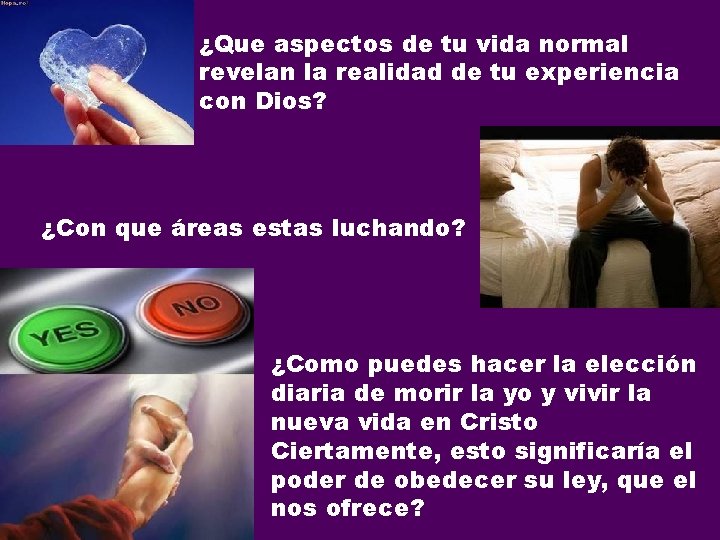 ¿Que aspectos de tu vida normal revelan la realidad de tu experiencia con Dios? ¿Con que áreas estas luchando? ¿Como puedes hacer la elección diaria de morir la yo y vivir la nueva vida en Cristo Ciertamente, esto significaría el poder de obedecer su ley, que el nos ofrece?