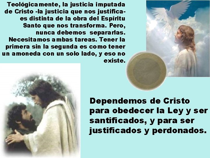 Teológicamente, la justicia imputada de Cristo -la justicia que nos justificaes distinta de la obra del Espíritu Santo que nos transforma. Pero, nunca debemos separarlas. Necesitamos ambas tareas. Tener la primera sin la segunda es como tener un amoneda con un solo lado, y eso no existe. Dependemos de Cristo para obedecer la Ley y ser santificados, y para ser justificados y perdonados.