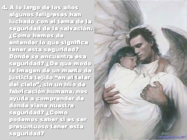 4. A lo largo de los años algunos feligreses han luchado con el tema de la seguridad de la salvación. ¿Como hemos de entender lo que significa tener esta seguridad? Donde se encuentra esa seguridad? ¿De que modo la imagen de un manto de justicia tejido “en el telar del cielo”, sin un hilo de fabricación humana, nos ayuda a comprender de donde viene nuestra seguridad? ¿Como podemos saber si es ser presuntuoso tener esta seguridad?