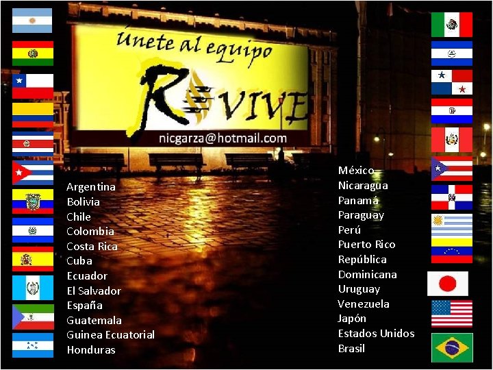 Argentina Bolivia Chile Colombia Costa Rica Cuba Ecuador El Salvador España Guatemala Guinea Ecuatorial Honduras México Nicaragua Panamá Paraguay Perú Puerto Rico República Dominicana Uruguay Venezuela Japón Estados Unidos Brasil
