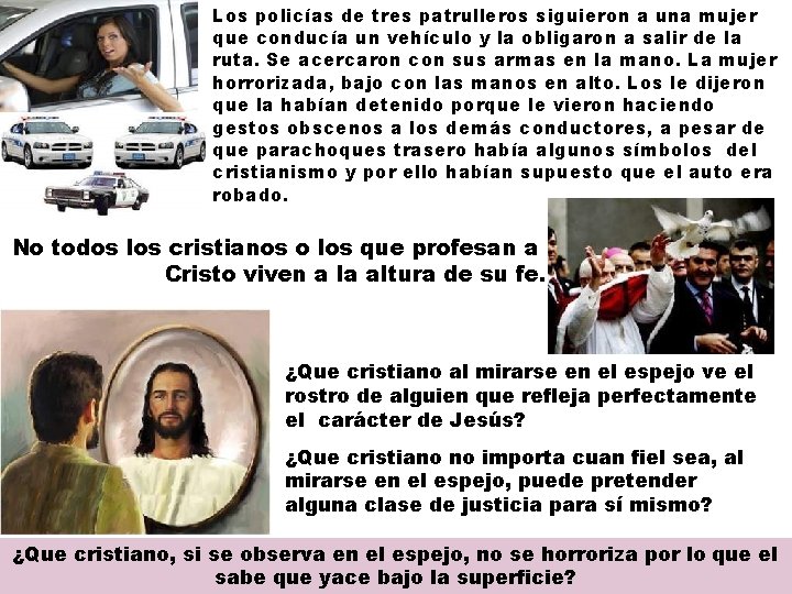Los policías de tres patrulleros siguieron a una mujer que conducía un vehículo y la obligaron a salir de la ruta. Se acercaron con sus armas en la mano. La mujer horrorizada, bajo con las manos en alto. Los le dijeron que la habían detenido porque le vieron haciendo gestos obscenos a los demás conductores, a pesar de que parachoques trasero había algunos símbolos del cristianismo y por ello habían supuesto que el auto era robado. No todos los cristianos o los que profesan a Cristo viven a la altura de su fe. ¿Que cristiano al mirarse en el espejo ve el rostro de alguien que refleja perfectamente el carácter de Jesús? ¿Que cristiano no importa cuan fiel sea, al mirarse en el espejo, puede pretender alguna clase de justicia para sí mismo? ¿Que cristiano, si se observa en el espejo, no se horroriza por lo que el sabe que yace bajo la superficie?