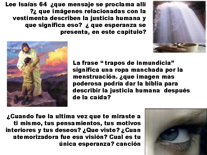 Lee Isaías 64 ¿que mensaje se proclama allí ? ¿ que imágenes relacionadas con la vestimenta describen la justicia humana y que significa eso? ¿ que esperanza se presenta, en este capitulo? La frase “ trapos de inmundicia” significa una ropa manchada por la menstruación. ¿que imagen mas poderosa podría dar la biblia para describir la justicia humana después de la caída? ¿Cuando fue la ultima vez que te miraste a ti mismo, tus pensamientos, tus motivos interiores y tus deseos? ¿Que viste? ¿Cuan atemorizadora fue esa visión? Cual es tu única esperanza? canción