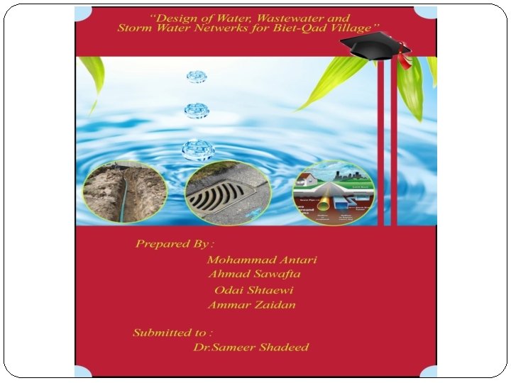 Water Distribution Network �According to our calculation and WDN designing . few of nodes have a pressure below 20 m in the maximum hour demand but these nodes have higher pressure values in other day times so the situation could be accepted since we considering fluctuation in demand through the day. �Network leakage not considered in designing the network. But it should be taken into consideration. Since it has a high value in agricultural areas and it might be reach 50 % of water in the network.