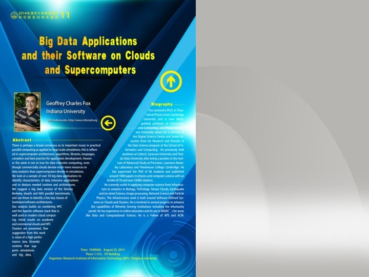 Big Data Applications and their Software on Clouds and Supercomputers Tsinghua University IV Chair Professor Presentation August 25 2014 Geoffrey Fox gcf@indiana. edu http: //www. infomall. org School of Informatics and Computing Digital Science Center Indiana University Bloomington
