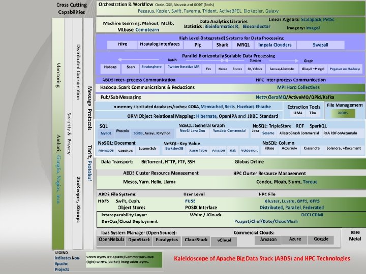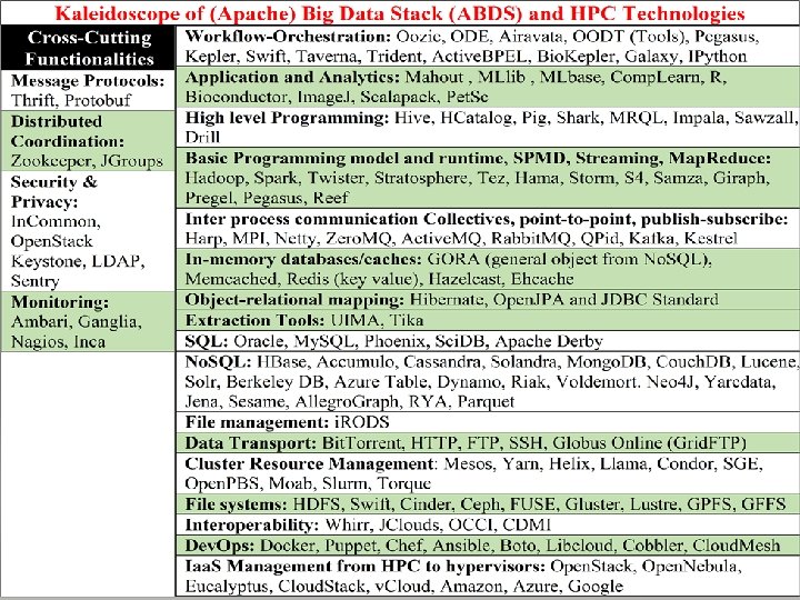 Maybe a Big Data Initiative would include • • • Workflow: Python or Kepler Data Analytics: Mahout, R, Image. J, Scalapack High level Programming: Hive, Pig Parallel Programming model: Hadoop, Spark, Giraph (Twister 4 Azure, Harp), MPI; Storm, Kapfka or Rabbit. MQ (Sensors) In-memory: Memcached Data Management: Hbase, Mongo. DB, My. SQL or Derby Distributed Coordination: Zookeeper Cluster Management: Yarn, Slurm File Systems: HDFS, Lustre Dev. Ops: Cloudmesh, Chef, Puppet, Docker, Cobbler Iaa. S: Amazon, Azure, Open. Stack, Libcloud Monitoring: Inca, Ganglia, Nagios