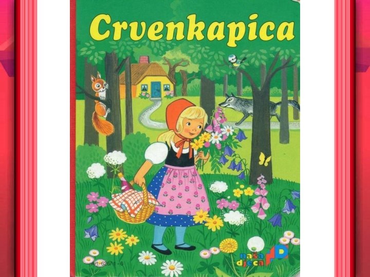Bila jednom jedna mala djevojčica. Svatko bi ju vidio, zavolio ju je, a najviše ju je voljela njezina baka. Jednom joj je mama poklonila baršunastu crvenu kapicu. Djevojčici je kapica tako dobro pristajala da druge više nije htjela nositi. Zato su je prozvali Crvenkapica.