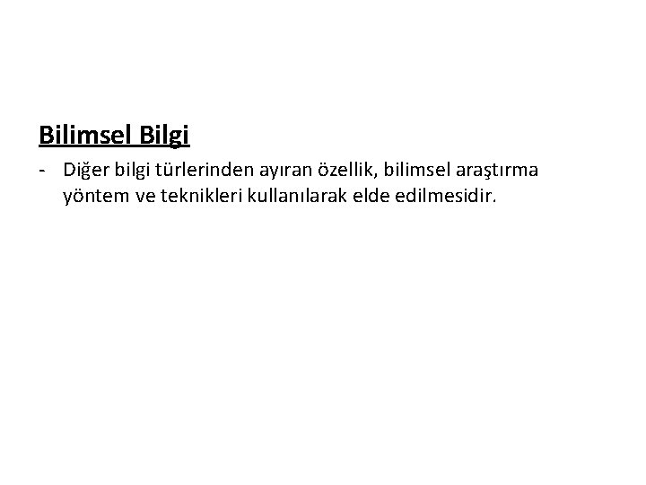 Bilimsel Bilgi - Diğer bilgi türlerinden ayıran özellik, bilimsel araştırma yöntem ve teknikleri kullanılarak elde edilmesidir.