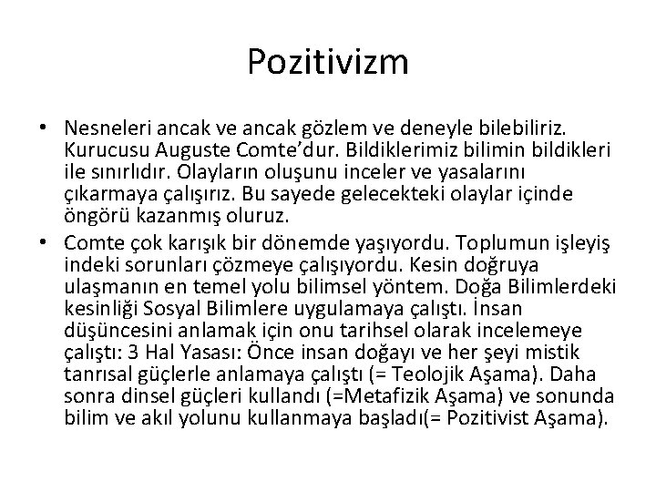 Pozitivizm • Nesneleri ancak ve ancak gözlem ve deneyle bilebiliriz. Kurucusu Auguste Comte’dur. Bildiklerimiz bilimin bildikleri ile sınırlıdır. Olayların oluşunu inceler ve yasalarını çıkarmaya çalışırız. Bu sayede gelecekteki olaylar içinde öngörü kazanmış oluruz. • Comte çok karışık bir dönemde yaşıyordu. Toplumun işleyiş indeki sorunları çözmeye çalışıyordu. Kesin doğruya ulaşmanın en temel yolu bilimsel yöntem. Doğa Bilimlerdeki kesinliği Sosyal Bilimlere uygulamaya çalıştı. İnsan düşüncesini anlamak için onu tarihsel olarak incelemeye çalıştı: 3 Hal Yasası: Önce insan doğayı ve her şeyi mistik tanrısal güçlerle anlamaya çalıştı (= Teolojik Aşama). Daha sonra dinsel güçleri kullandı (=Metafizik Aşama) ve sonunda bilim ve akıl yolunu kullanmaya başladı(= Pozitivist Aşama).