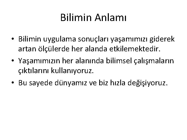 Bilimin Anlamı • Bilimin uygulama sonuçları yaşamımızı giderek artan ölçülerde her alanda etkilemektedir. • Yaşamımızın her alanında bilimsel çalışmaların çıktılarını kullanıyoruz. • Bu sayede dünyamız ve biz hızla değişiyoruz.