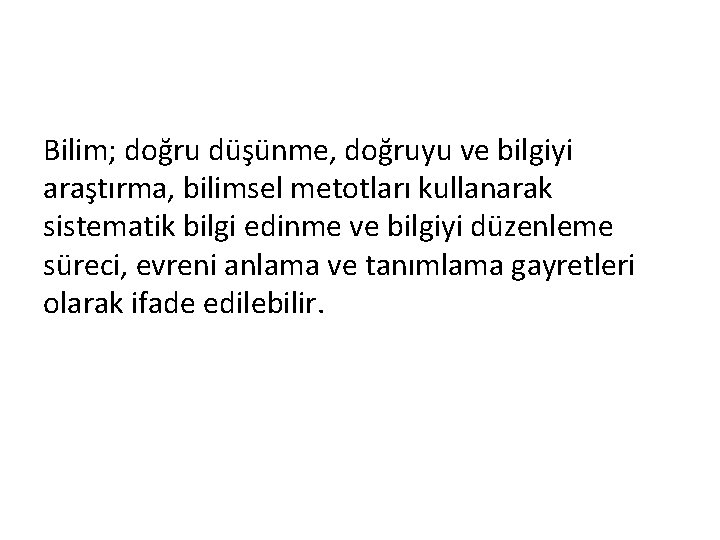 Bilim; doğru düşünme, doğruyu ve bilgiyi araştırma, bilimsel metotları kullanarak sistematik bilgi edinme ve bilgiyi düzenleme süreci, evreni anlama ve tanımlama gayretleri olarak ifade edilebilir.