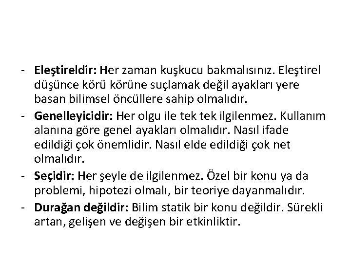 - Eleştireldir: Her zaman kuşkucu bakmalısınız. Eleştirel düşünce körüne suçlamak değil ayakları yere basan bilimsel öncüllere sahip olmalıdır. - Genelleyicidir: Her olgu ile tek ilgilenmez. Kullanım alanına göre genel ayakları olmalıdır. Nasıl ifade edildiği çok önemlidir. Nasıl elde edildiği çok net olmalıdır. - Seçidir: Her şeyle de ilgilenmez. Özel bir konu ya da problemi, hipotezi olmalı, bir teoriye dayanmalıdır. - Durağan değildir: Bilim statik bir konu değildir. Sürekli artan, gelişen ve değişen bir etkinliktir.