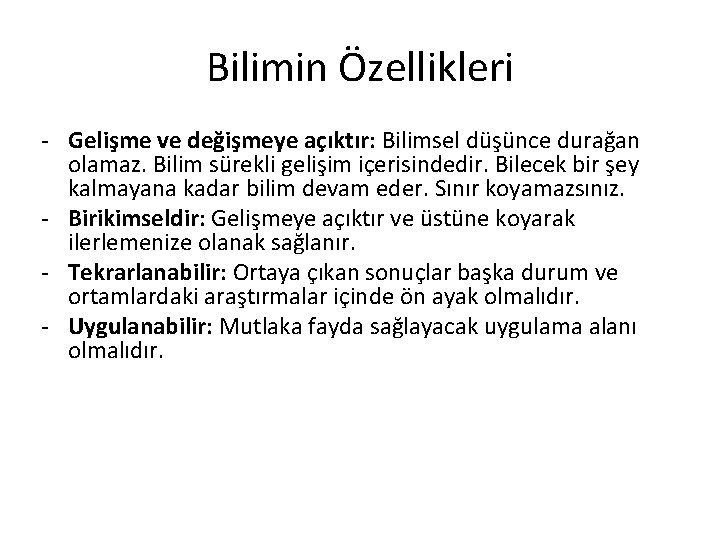 Bilimin Özellikleri - Gelişme ve değişmeye açıktır: Bilimsel düşünce durağan olamaz. Bilim sürekli gelişim içerisindedir. Bilecek bir şey kalmayana kadar bilim devam eder. Sınır koyamazsınız. - Birikimseldir: Gelişmeye açıktır ve üstüne koyarak ilerlemenize olanak sağlanır. - Tekrarlanabilir: Ortaya çıkan sonuçlar başka durum ve ortamlardaki araştırmalar içinde ön ayak olmalıdır. - Uygulanabilir: Mutlaka fayda sağlayacak uygulama alanı olmalıdır.
