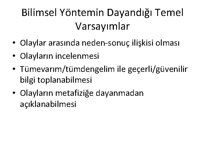Bilimsel Yöntemin Dayandığı Temel Varsayımlar • Olaylar arasında neden-sonuç ilişkisi olması • Olayların incelenmesi • Tümevarım/tümdengelim ile geçerli/güvenilir bilgi toplanabilmesi • Olayların metafiziğe dayanmadan açıklanabilmesi