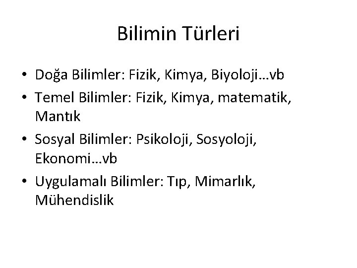 Bilimin Türleri • Doğa Bilimler: Fizik, Kimya, Biyoloji…vb • Temel Bilimler: Fizik, Kimya, matematik, Mantık • Sosyal Bilimler: Psikoloji, Sosyoloji, Ekonomi…vb • Uygulamalı Bilimler: Tıp, Mimarlık, Mühendislik