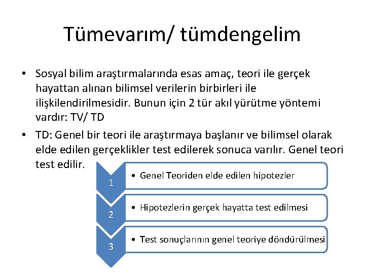Tümevarım/ tümdengelim • Sosyal bilim araştırmalarında esas amaç, teori ile gerçek hayattan alınan bilimsel verilerin birbirleri ile ilişkilendirilmesidir. Bunun için 2 tür akıl yürütme yöntemi vardır: TV/ TD • TD: Genel bir teori ile araştırmaya başlanır ve bilimsel olarak elde edilen gerçeklikler test edilerek sonuca varılır. Genel teori test edilir. 1 2 3 • Genel Teoriden elde edilen hipotezler • Hipotezlerin gerçek hayatta test edilmesi • Test sonuçlarının genel teoriye döndürülmesi