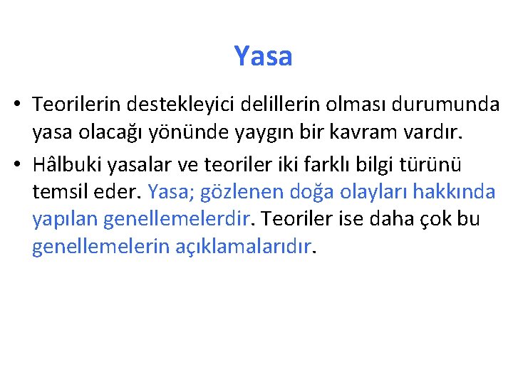 Yasa • Teorilerin destekleyici delillerin olması durumunda yasa olacağı yönünde yaygın bir kavram vardır. • Hâlbuki yasalar ve teoriler iki farklı bilgi türünü temsil eder. Yasa; gözlenen doğa olayları hakkında yapılan genellemelerdir. Teoriler ise daha çok bu genellemelerin açıklamalarıdır.