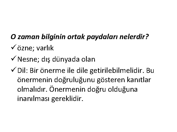O zaman bilginin ortak paydaları nelerdir? ü özne; varlık ü Nesne; dış dünyada olan ü Dil: Bir önerme ile dile getirilebilmelidir. Bu önermenin doğruluğunu gösteren kanıtlar olmalıdır. Önermenin doğru olduğuna inanılması gereklidir.