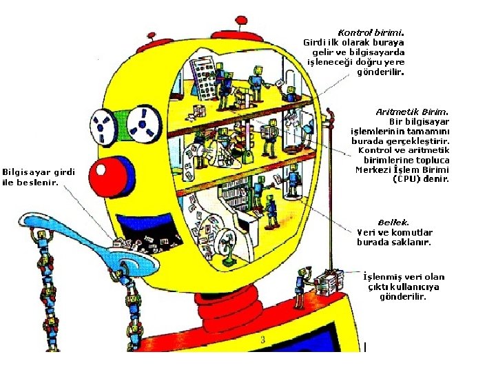 Bilgisayarın Mimarı Yapısı ve Çalışma Mantığı Bilgisayarı yapısal olarak; bilgilerin girilmesi, girilen bilgilerin belirtilen durumlara göre işlenmesi, işlem sonuçlarının alınması olarak üç temel fonksiyona sahip bir makine şeklinde tanımlayabiliriz. Bu üç temel fonksiyonu gerçekleştirebilmek için sahip olması gereken mimari ise; 1. Girdi Üniteleri. 2. Merkezi İşlem Birimi (CPU) (İşlemci) 3. Çıktı Üniteleri’dir. 29. 10. 2021 3