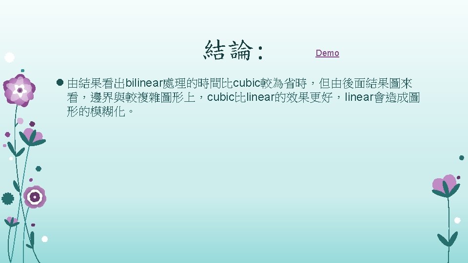 時間比較: l 圖片解析度: Cat: 550*413 Lena: 256*256 Bird: 1024*768 Baboon: 512*512 Linear(*5) Cubic(*5) Linear(*0. 7) Cubic(*0. 7) Cat 1. 327 s 2. 798 s 0. 031 s 0. 064 s Lena 0. 396 s 0. 816 s 0. 014 s 0. 029 s Bird 4. 594 s 9. 666 s 0. 108 s 0. 191 s Baboon 1. 527 s 3. 222 s 0. 04 s 0. 075 s