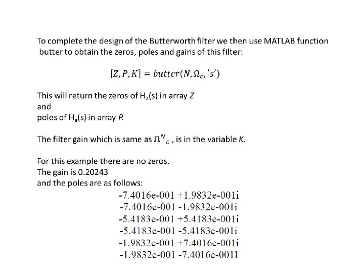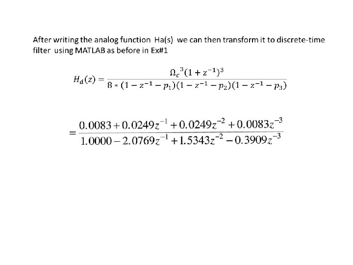 Example #2: Design a lowpass filter with § Cuttoff frequency c = /5 rad/sample § Transition bandwidth of = 0. 2 radians/sample = 0. 1 cycles/sample § With a ripple of = 0. 1 Use a Butterworth analog filter Set T = 1.