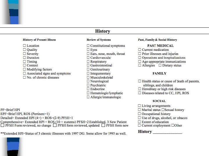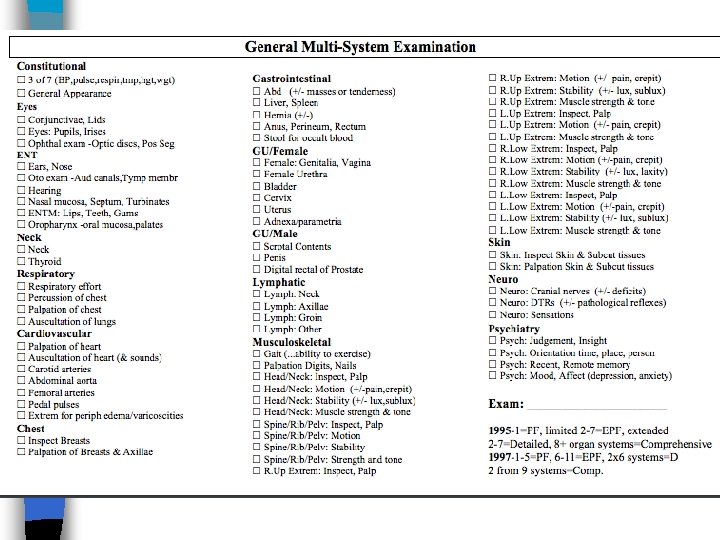 Review of Systems • One item in each system • CAN be documented in HPI • CANNOT Double dip with HPI