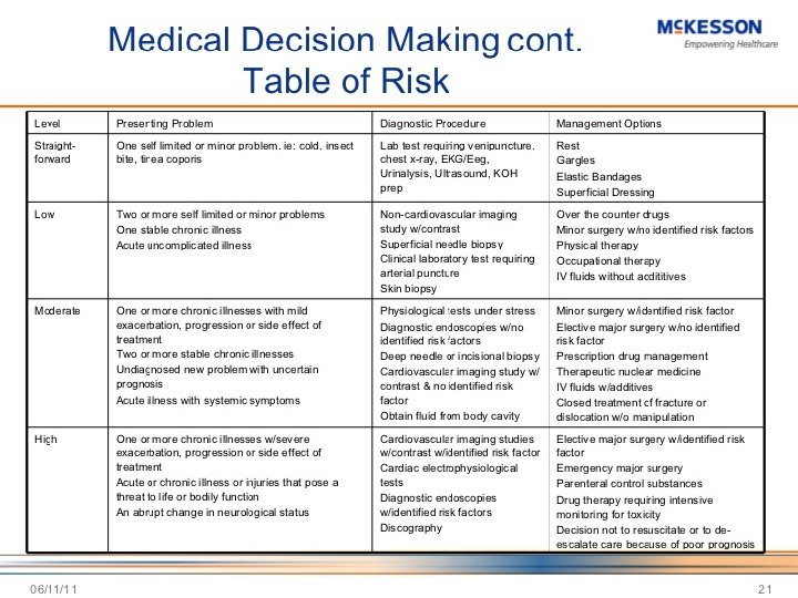 Determining level of decision making 2/3 x #Dx. P Data Risk MDM 0 -1 Minimum Straight forward 2 2 Low Complexity 3 3 Moderate complexity 4 4 High complexity