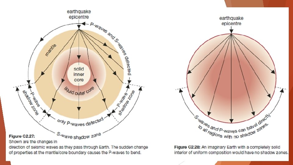 Inside the Earth As depth increases, the speed of both P-waves and S-waves increase. Sudden changes in rock properties cause the waves to quickly change direction. This is similar to light waves bending as they enter a lens. This sudden change in direction causes a region where P-waves from an earthquake cannot be detected; this region is called a P-wave shadow zone. Researchers concluded that the P-wave shadow zone could be explained if Earth’s centre were composed of different material than the mantle.
