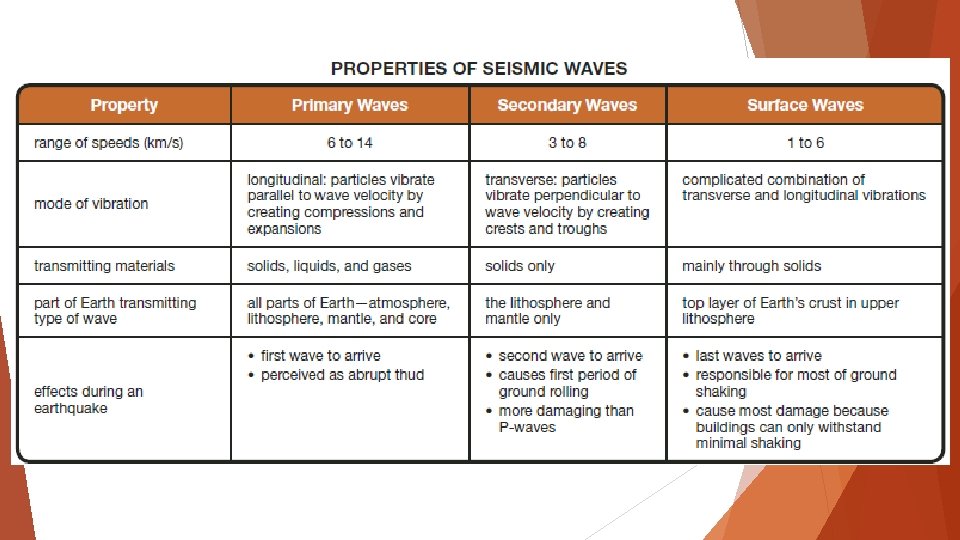 Types of waves So that energy released at the focus can reach the surface, seismic waves have to transfer the energy through the subsurface rock. One way for seismic waves to transfer energy is through primary waves, which are often called Pwaves for short. As the name suggests, the primary or P-waves are the first to arrive because they travel the fastest. As these waves travel through the rock, the matter is alternately compressed and then expanded. Since P-waves are like an extremely low-frequency sound wave, they are able to travel through solids, liquids, and gases.