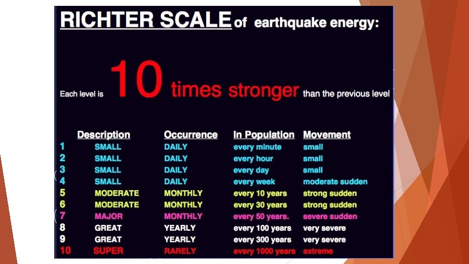 Richter Scale The time interval between the two waves can also be used with other values to determine the Richter magnitude of an earthquake. The Richter magnitude is useful for both categorizing and comparing earthquakes. An earthquake with a Richter magnitude of 3. 0 is barely detectable by people. The Alaska Earthquake of 1964 had a Richter magnitude of 9. 2, second only to the 9. 5 magnitude of the Chilean earthquake of 1960. Earthquakes with larger magnitudes may have occurred prior to the development of the Richter scale.