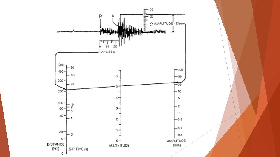 Summary Earthquakes occur due to the sudden release of stored energy. This energy builds up over time due to the motion of crustal plates. When the energy is released, one plate suddenly moves relative to another—this causes seismic waves to travel through the surrounding rock. Primary waves, or P-waves, travel the fastest, so they are the first to arrive at some other point on Earth’s crust. Secondary waves, or S-waves, arrive next and these tend to cause more damage than P-waves. Although they do not travel as far as primary waves and move at relatively low speeds, surface waves tend to do the greatest damage during an earthquake. The difference in the arrival times of P-waves and S-waves can be used to determine the location of the epicentre of the earthquake if data from at least three seismographs is available. This information can also be combined with the maximum amplitude of the S-wave to determine the Richter magnitude number of the earthquake. Summary Questions Assignment Booklets