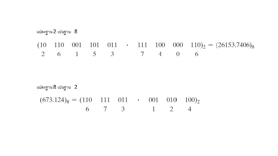 แปลงฐาน 2 เปนฐาน 16 10 1100 0110 1011. 1111 0000 0110 = (2 C 6 B. F 06)16 2 C 6 B F 0 6 แปลงฐาน 16 เปนฐาน 2 (1 BB. 2 A)16 = 1 1011. 0010 1 B B 2 A