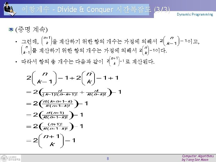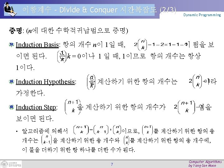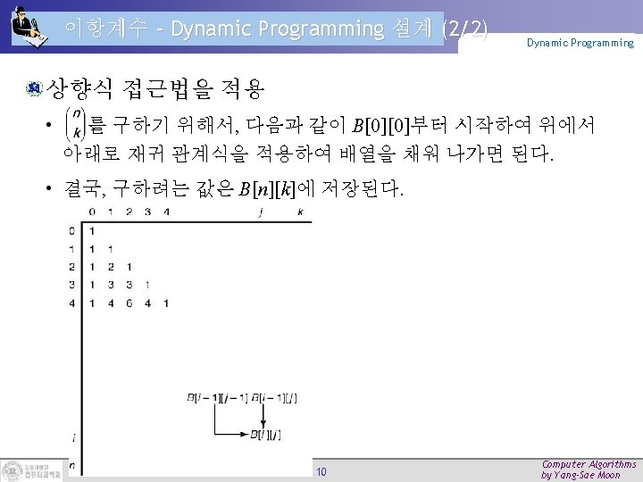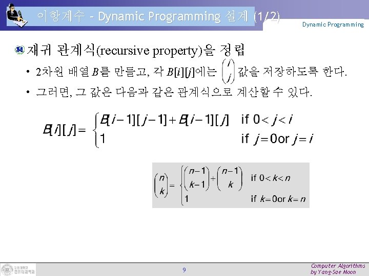 이항계수(Binomial Coefficient) – 정의 Dynamic Programming 이항계수 구하는 공식 • The binomial coefficient is the number of ways of picking k unordered outcomes from n possibilities, also known as a combination n. Ck. 계산량이 많은 n!이나 k!을 계산하지 않고 이항계수를 구하기 위해 서 통상 다음 수식을 사용한다. 4 Computer Algorithms by Yang-Sae Moon