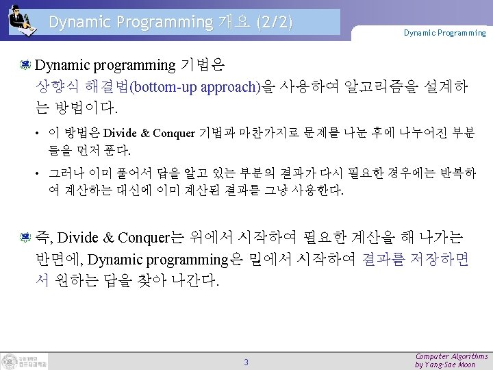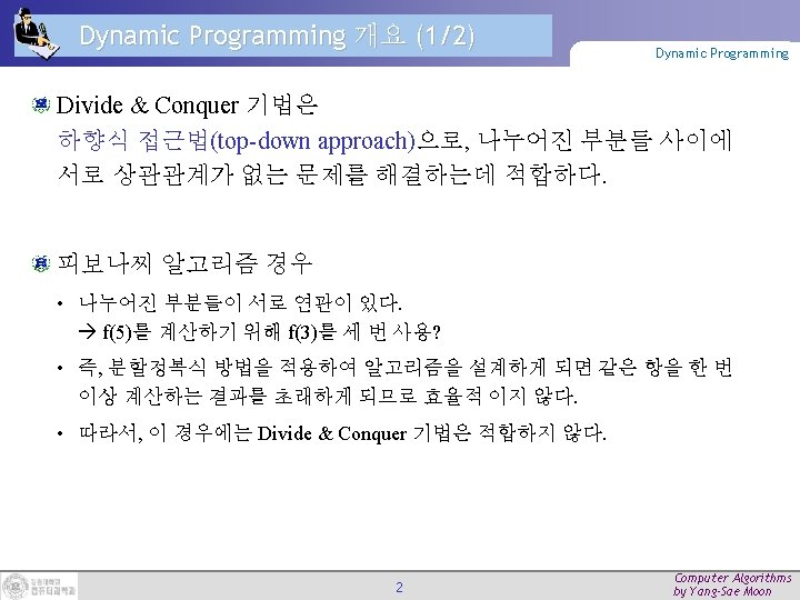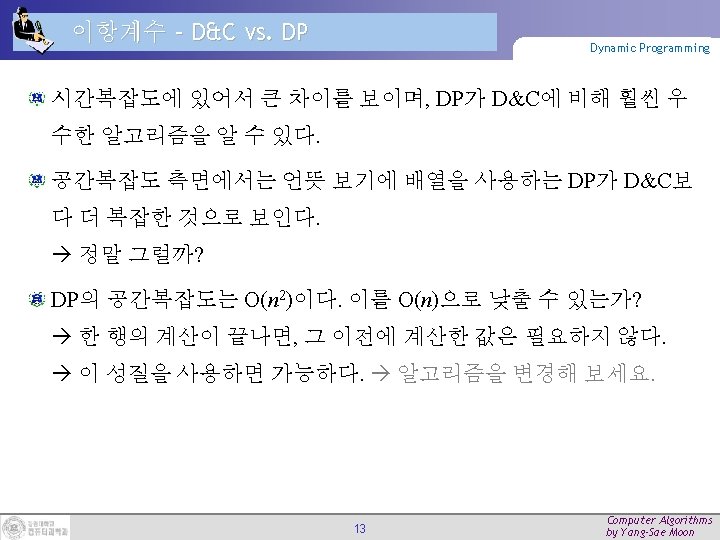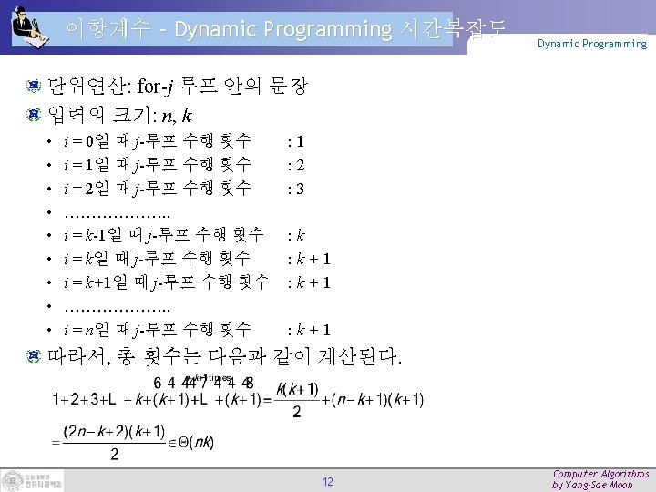 이항계수 – Dynamic Programming 알고리즘 Dynamic Programming 문제: 이항계수를 계산한다. 입력: 음수가 아닌 정수 n과 k, 여기서 k n 출력: 이항계수 결과 값 알고리즘: int bin 2(int n, int k) { index i, j; int B[0. . n][0. . k]; for(i=0; i <= n; i++) for(j=0; j <= minimum(i, k); j++) if (j==0 || j == i) B[i][j] = 1; else B[i][j] = B[i-1][j-1] + B[i-1][j]; return B[n][k]; } 11 Computer Algorithms by Yang-Sae Moon