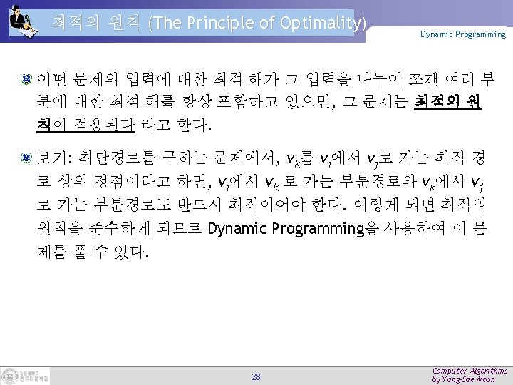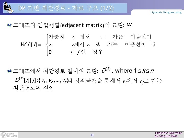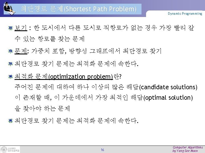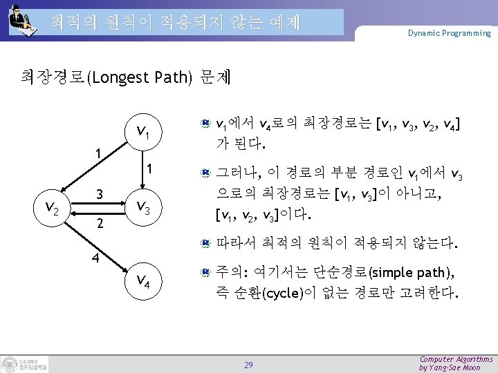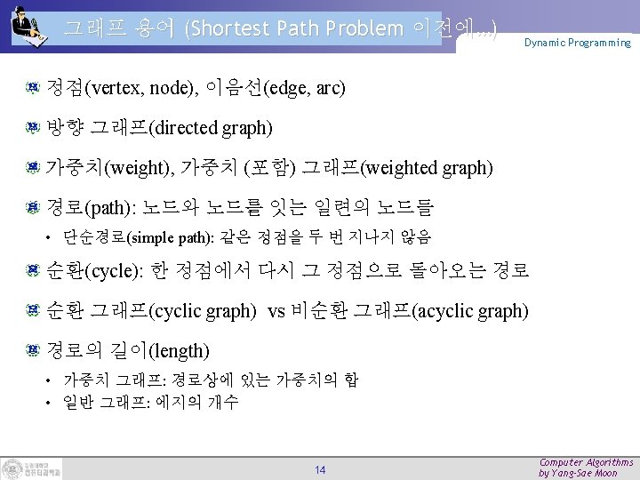 가중치 포함 방향 그래프 예제 1 v 1 3 5 v 5 3 Dynamic Programming 9 1 2 3 2 v 4 4 15 v 2 v 3 Computer Algorithms by Yang-Sae Moon
