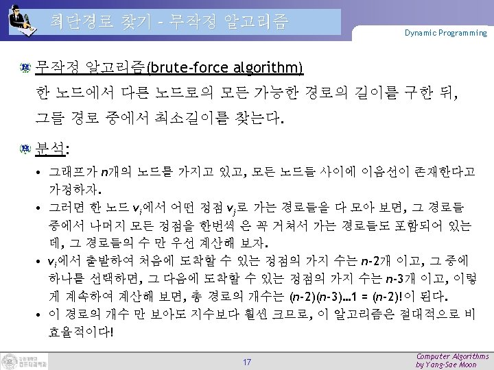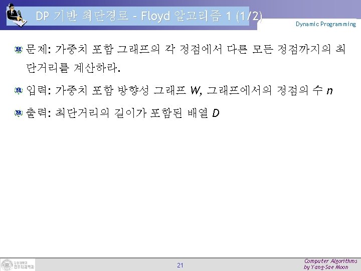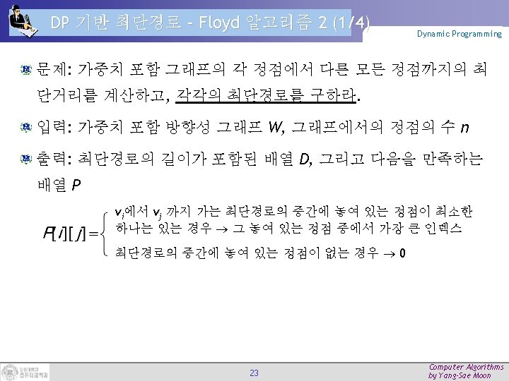 DP 기반 최단경로 – Floyd 알고리즘 1 (2/2) Dynamic Programming 알고리즘 void floyd(int n, const number W[][], number D[][]) { int i, j, k; D = W; for(k=1; k <= n; k++) for(i=1; i <= n; i++) for(j=1; j <= n; j++) D[i][j] = minimum(D[i][j], D[i][k]+D[k][j]); } 모든 경우를 고려한 분석: • 단위연산: for-j 루프안의 지정문 • 입력크기: 그래프에서의 정점의 수 n 22 Computer Algorithms by Yang-Sae Moon
