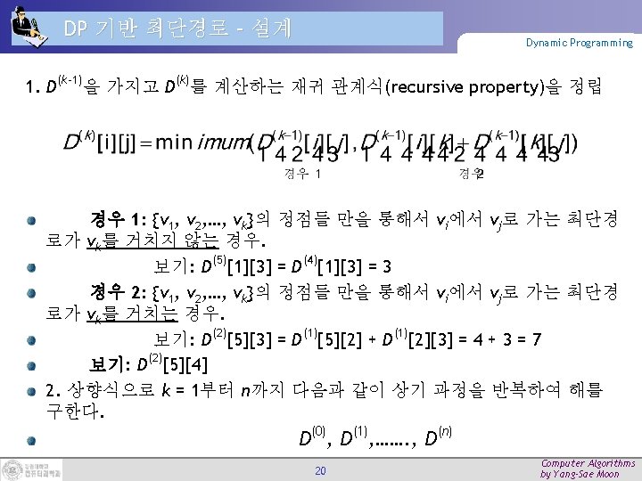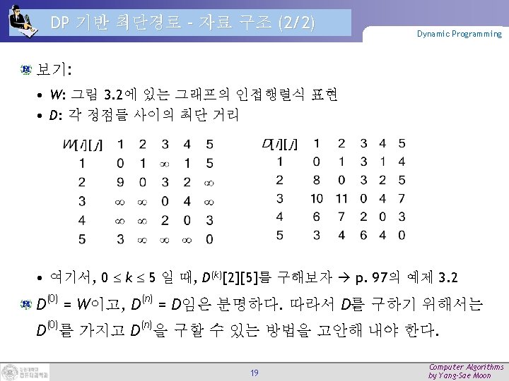 DP 기반 최단경로 – Floyd 알고리즘 2 (3/4) Dynamic Programming 그림 3 -2의 예를 가지고 (D와) P를 구해 보시오. 25 Computer Algorithms by Yang-Sae Moon