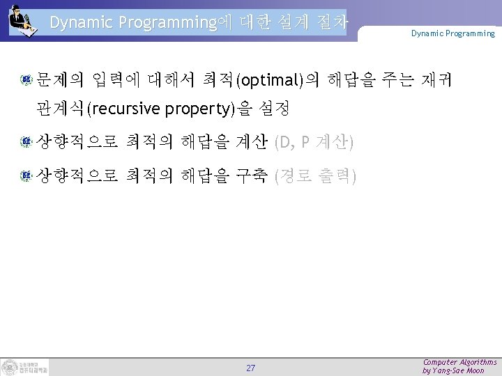 DP 기반 최단경로 – Floyd 알고리즘 2 (4/4) Dynamic Programming 최단경로 출력 알고리즘 void path(index q, r) { if (P[q][r] != 0) { path(q, P[q][r]); count << “ v” << P[q][r]; path(P[q][r], r); } } 앞서의 P로 path(5, 3)을 출력하면 다음과 같다. path(5, 3) = 4 path(5, 4) = 1 path(5, 1) = 0 v 1 path(1, 4) = 0 v 4 path(4, 3) = 0 결과: v 1 v 4. (즉, v 5에서 v 3으로 가는 최단경로는 v 5, v 1, v 4, v 3, 이다. ) 26 Computer Algorithms by Yang-Sae Moon