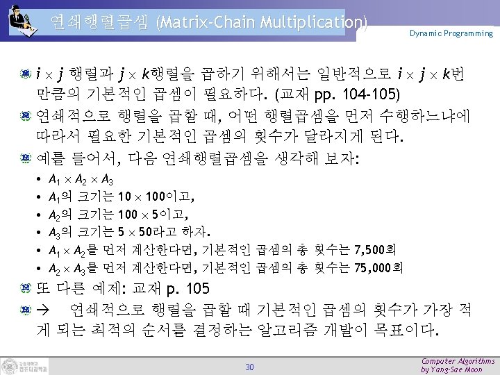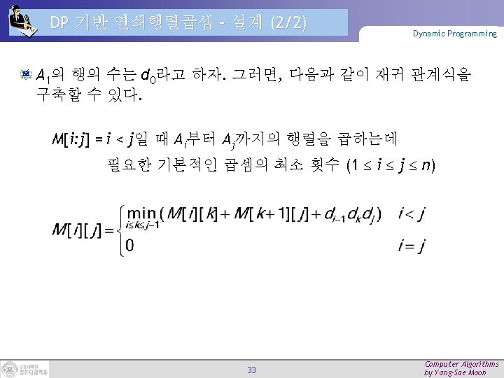 DP 기반 연쇄행렬곱셈 – 설계 (1/2) Dynamic Programming dk를 행렬 Ak의 열(column)의 수라고 하자. 그러면 자연히 Ak의 행 (row)의 수는 dk-1가 된다. 32 Computer Algorithms by Yang-Sae Moon