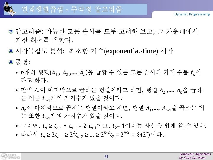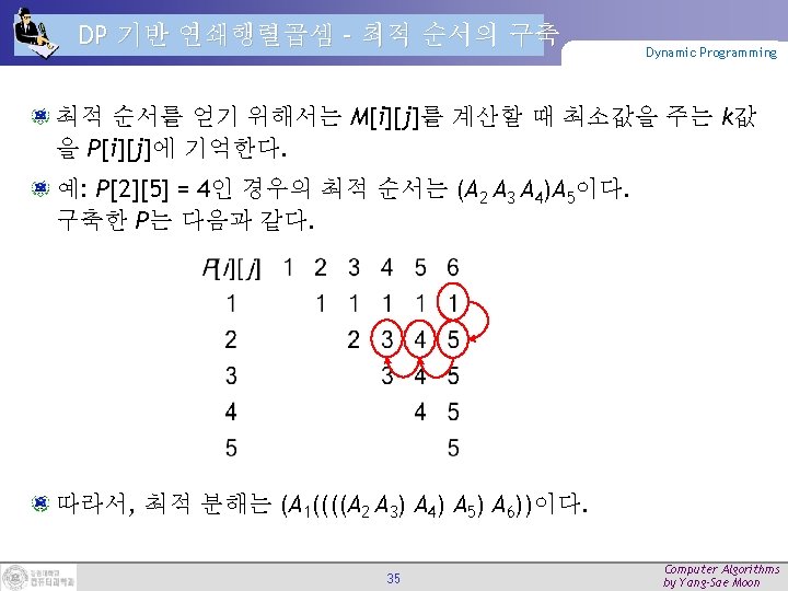 DP 기반 연쇄행렬곱셈 – 재귀식 적용 예 34 Dynamic Programming Computer Algorithms by Yang-Sae Moon