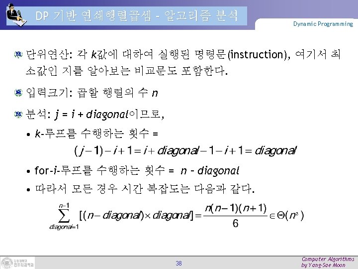 DP 기반 연쇄행렬곱셈 – 알고리즘 (2/2) Dynamic Programming 알고리즘 int minmult(int n, const int d[], index P[][]) { index i, j, k, diagonal; int M[1. . n, 1. . n]; for(i=1; i <= n; i++) M[i][j] = 0; for(diagonal = 1; diagonal <= n-1; diagonal++) for(i=1; i <= n-diagonal; i++) { j = i + diagonal; M[i][j] = minimum (M[i][k]+M[k+1][j]+d[i-1]*d[k]*d[j]); i k j-1 P[i][j] = 최소치를 주는 k의 값 } return M[1][n]; } 37 Computer Algorithms by Yang-Sae Moon