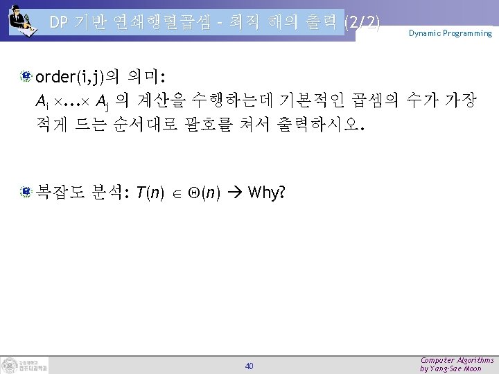 DP 기반 연쇄행렬곱셈 – 최적 해의 출력 (1/2) Dynamic Programming 문제: n개의 행렬을 곱하는 최적의 순서를 출력하시오. 입력: n과 앞서 구한 2차원 배열 P 출력: 최적의 순서 알고리즘: int minmult(int n, const int d[], index P[][]) void order(index i, index j) { if (i == j) cout << “A” << i; else { k = P[i][j]; cout << “(”; order(i, k); order(k+1, j); cout << “)”; } } 39 Computer Algorithms by Yang-Sae Moon