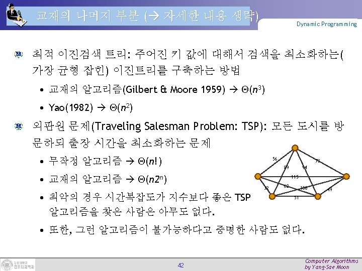 DP 기반 연쇄행렬곱셈 – 개선된 솔루션 Dynamic Programming Yao(1982) (n 2) Hu and Shing(1982, 1984) (n lg n) 41 Computer Algorithms by Yang-Sae Moon