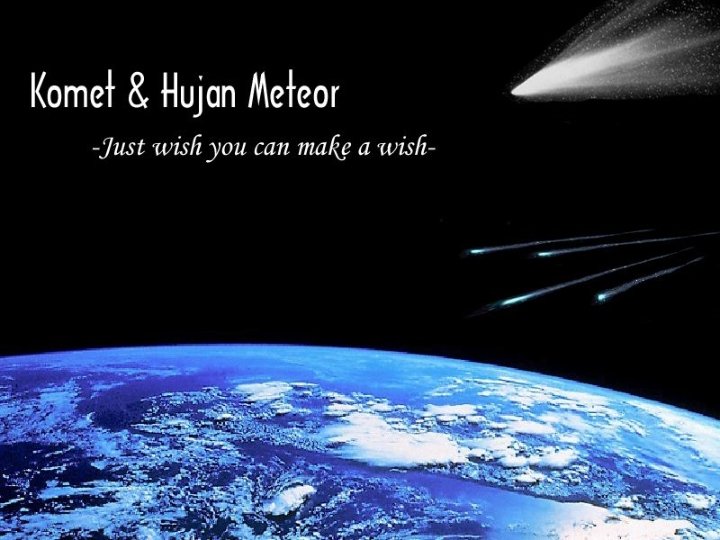 Terjadinya hujan meteor 1. komet melintasi orbit bumi Serpihan debunya berhamburan di sepanjang lintasan 2. debu-debu itu ‘menabrak’ atmosfer bumi 3. terjadi hujan meteor Video: IMO Animasi ► Hujan Meteor Leonid