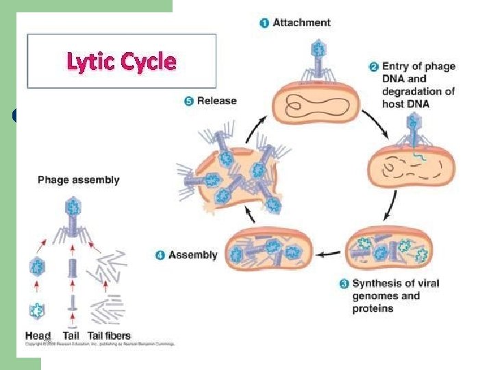 Virulent Bacteriophages l l Always go through “lytic cycle”, destroying host bacterium; usually within an hour Steps in the lytic cycle: (viral replication) – – – Attachment (adsorption) Penetration Biosynthesis (replication) Assembly (maturation) Release (lysis) of virions