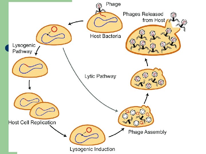 Virulent vs Temperate Bacteriophages l l Both inject their genetic material into a cell to invade it Process that follows is different