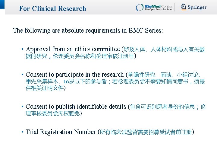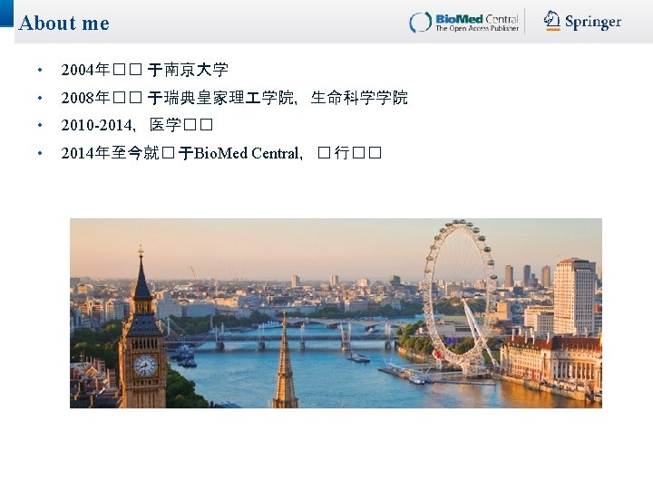 About Bio. Med Central • First open access publisher 最早的开放� 取出版社 - 15 years old this year; >290 journals; 30, 000 articles + per year - Now part of Springer Nature • Every research article is: 每篇文章都符合以下要求 - Peer reviewed 通� 同行�� - Freely and immediately accessible to everyone; CC-BY, 立即� 所有人免� 开放 - Archived in Pub. Med Central and other archives 永久存� 于Pub. Med Central及其他数据� • Many journals are: - Indexed in MEDLINE, Biosis (all biology titles) - Tracked by Thomson-Reuters for Impact Factors 大部分期刊被SCI收� ,有影响因子