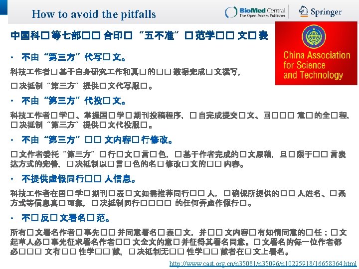 How to avoid the pitfalls • Never hand over total control of your manuscript to anybody who is not an author. 永远不要把自己的文章交给不是本文作者的人 • If you want to use an agency to improve the manuscript, tell the editor that they are acting on your behalf when you submit your manuscript. 如果需要使用第三方来改进自己的文章,一定要告诉编辑有人替你做这些。 • Remember that you, the authors, will still be responsible for anything the agency does. 切记,作为本文作者,随时要为第三方机构的一切操作负责