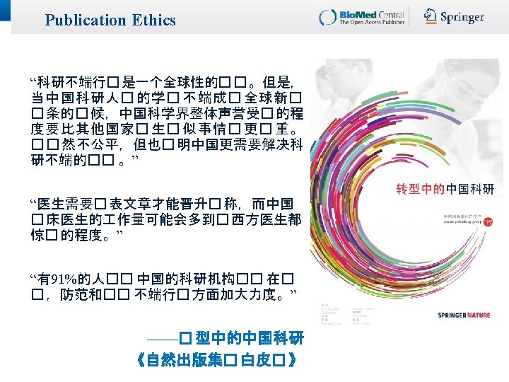 Publication Ethics “A set of common rules among authors, editors, reviewers and publishers to protect integrity of the scientific record”. Charlotte Haug, previous Vice Chair COPE. 出版� 理是作者、� � 、� 稿人和出版社共同遵循以保� 科学� � � 信的通用� �。 • All parties responsible. Authors, reviewers, editors but responsibility rests on authors. 所有人都��� ,作者� 任尤其大。 • Readers can trust the articles they read and make informed decisions � 者可信任所� 的文章,并作出判断。
