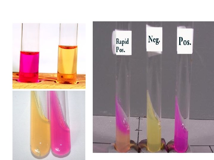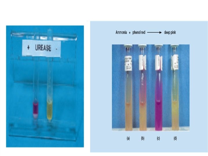 Urease Test • Some bacteria are able to produce an enzyme called urease that attacks the nitrogen and carbon bond in amide compounds such as urea, forming the end products ammonia, CO 2, and water. • Urease activity (the urease test) is detected by growing bacteria in medium containing urea and using a p. H indicator such as phenol red. When urea is hydrolyzed, ammonia accumulates in the medium and makes it alkaline. This increase in p. H causes the indicator to change from orange-red to deep pink and is a positive test for urea hydrolysis. • • This test is particularly useful in distinguishing the genus Proteus from other enteric bacteria